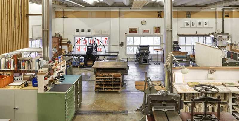 The printing works impart knowledge in wood and linocut, letterpress printing, etching techniques and lithography, develops commissioned works, is available to artists as a workplace and is open to all interested persons. -